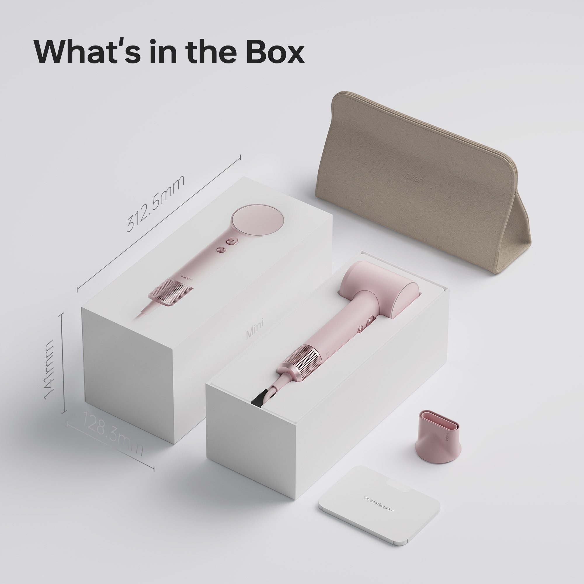Mini-hårtørreren inkluderer en opbevaringspose (grå eller brun). Farven sendes tilfældigt. Begge tasker er lavet af samme materiale og har samme størrelse.