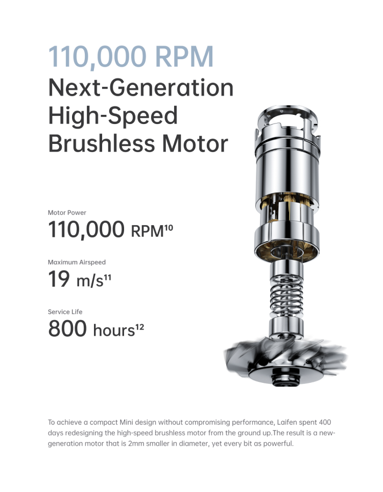 - [Potenziato dal nostro motore brushless miniaturizzato da 110.000 giri al minuto che offre le prestazioni iconiche di Laifen e dotato di OTTIMIZZAZIONI DEL FLUSSO D'ARIA, il Mini dimostra che le grandi cose possono arrivare in piccoli pacchetti.