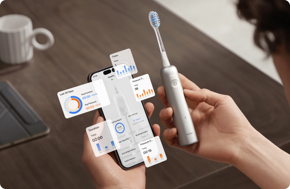 Smart Pressure Sensor ensures every brush is just right. The sensor continuously monitors your brushing force, ensuring safe and effective cleaning with every stroke. When excessive pressure is detected, it instantly remind you and adjusts motor speed and to prevent gum irritation and enamel wear.