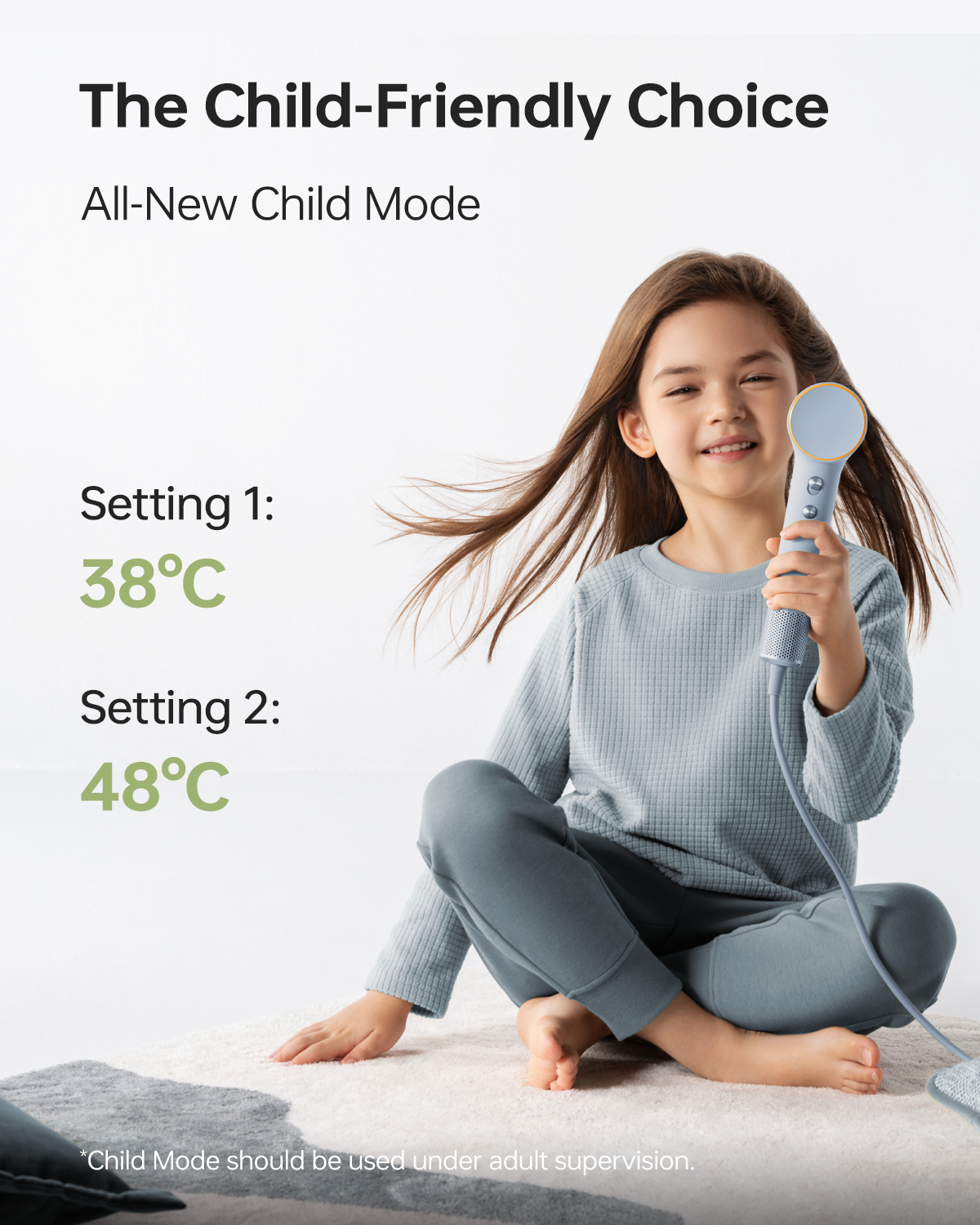 - [PATOGUS VAIKAMS] Visiškai naujas VAIKAMS skirtas režimas yra švelnus švelnesniems vaikų plaukams ir užtikrina saugesnį plaukų džiovinimo būdą. Yra du nustatymai: mažo greičio 38 °C ir didelio greičio 48 °C.