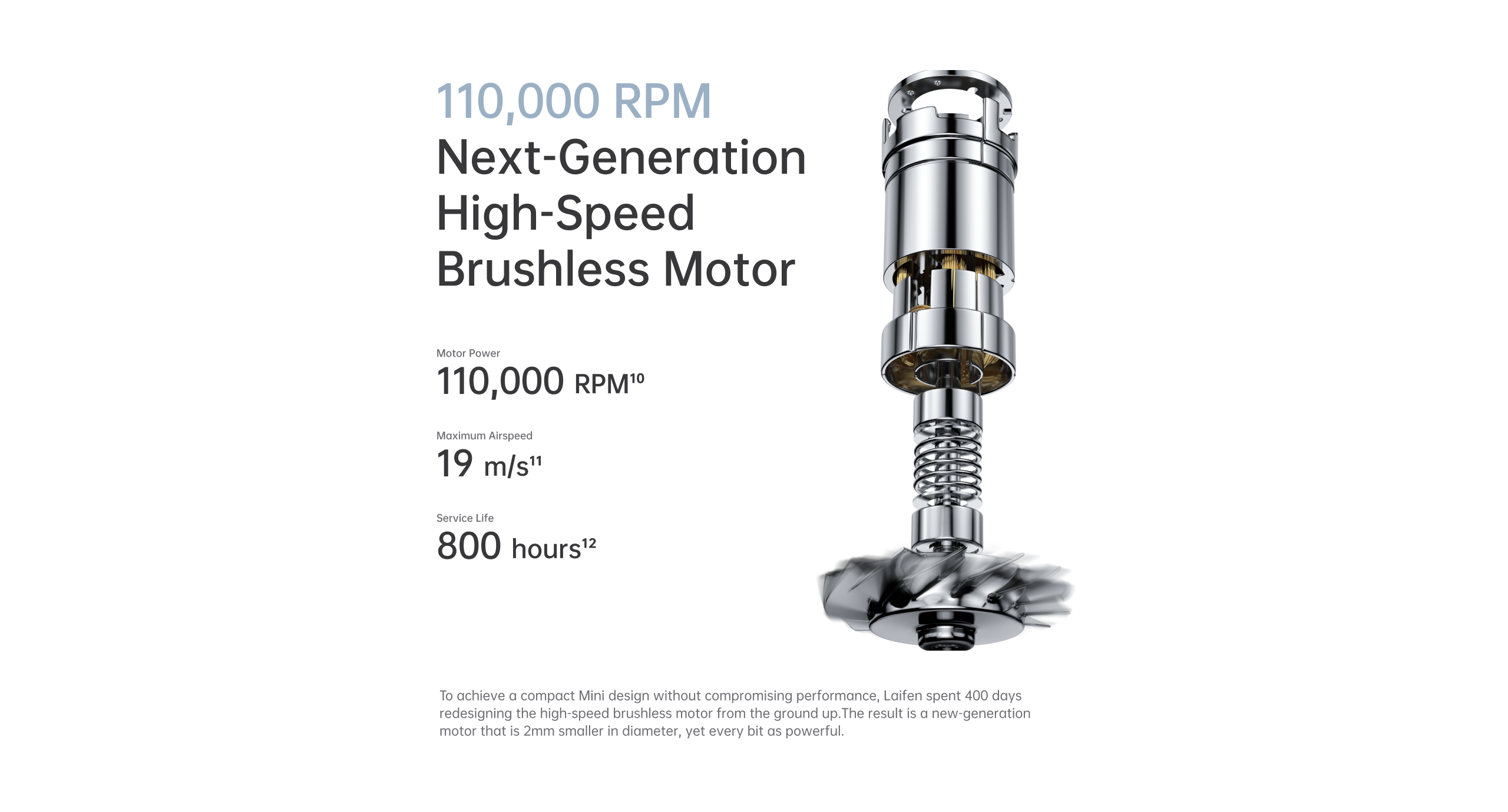 - [KRACHTIGE PRESTATIES] Aangedreven door onze geminiaturiseerde 110.000 tpm borstelloze motor die Laifen's ICONISCHE PRESTATIES levert en met uitgebreide LUCHTSTROOM OPTIMZATIES, bewijst de Mini dat grote dingen in kleine verpakkingen kunnen komen.