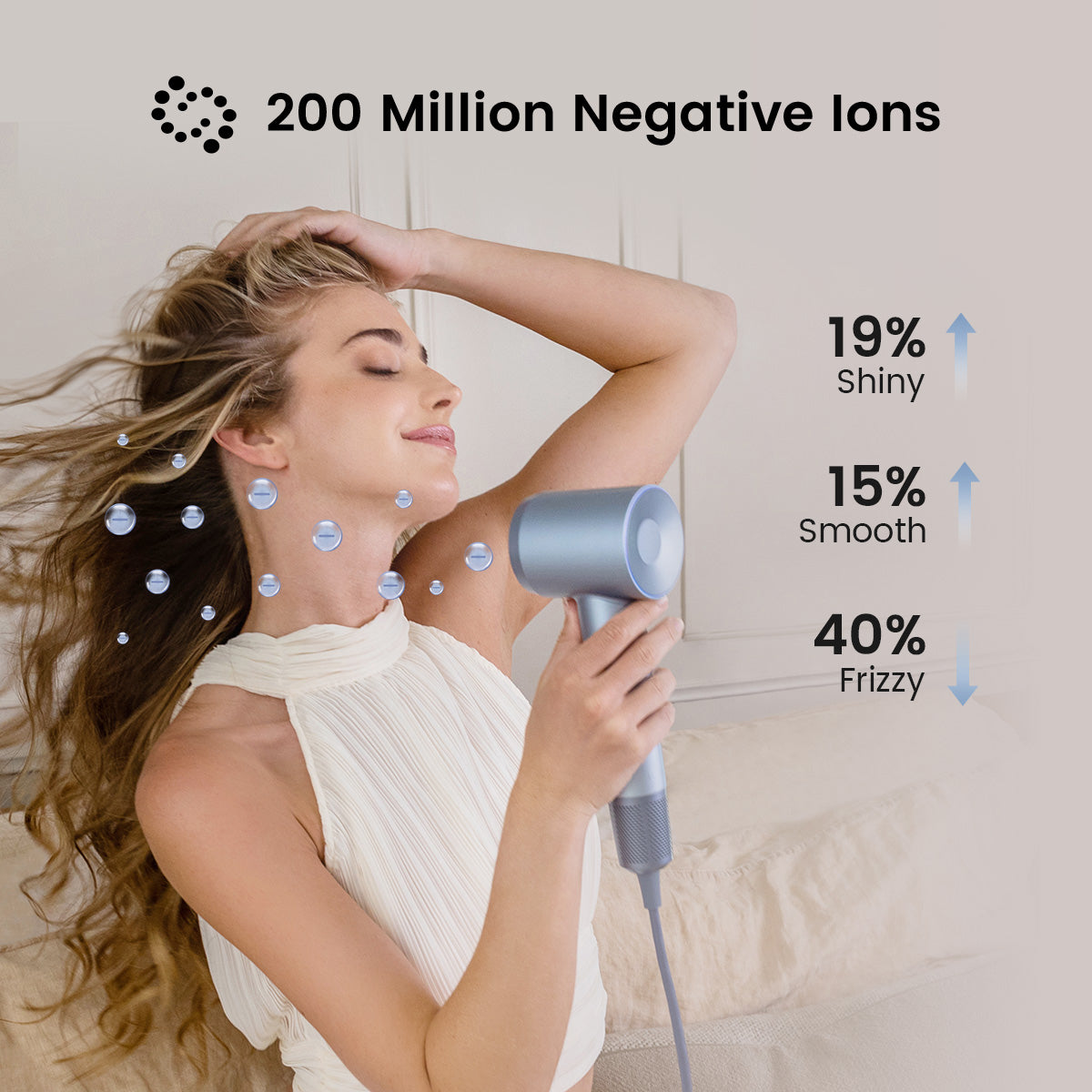 While drying, ionic generators emit negative ions that neutralize positive ions in water molecules in your hair, breaking them into smaller particles. This process speeds up drying, locks in moisture, and eliminates static electricity—taming frizz and flyaways for smooth, shiny hair.