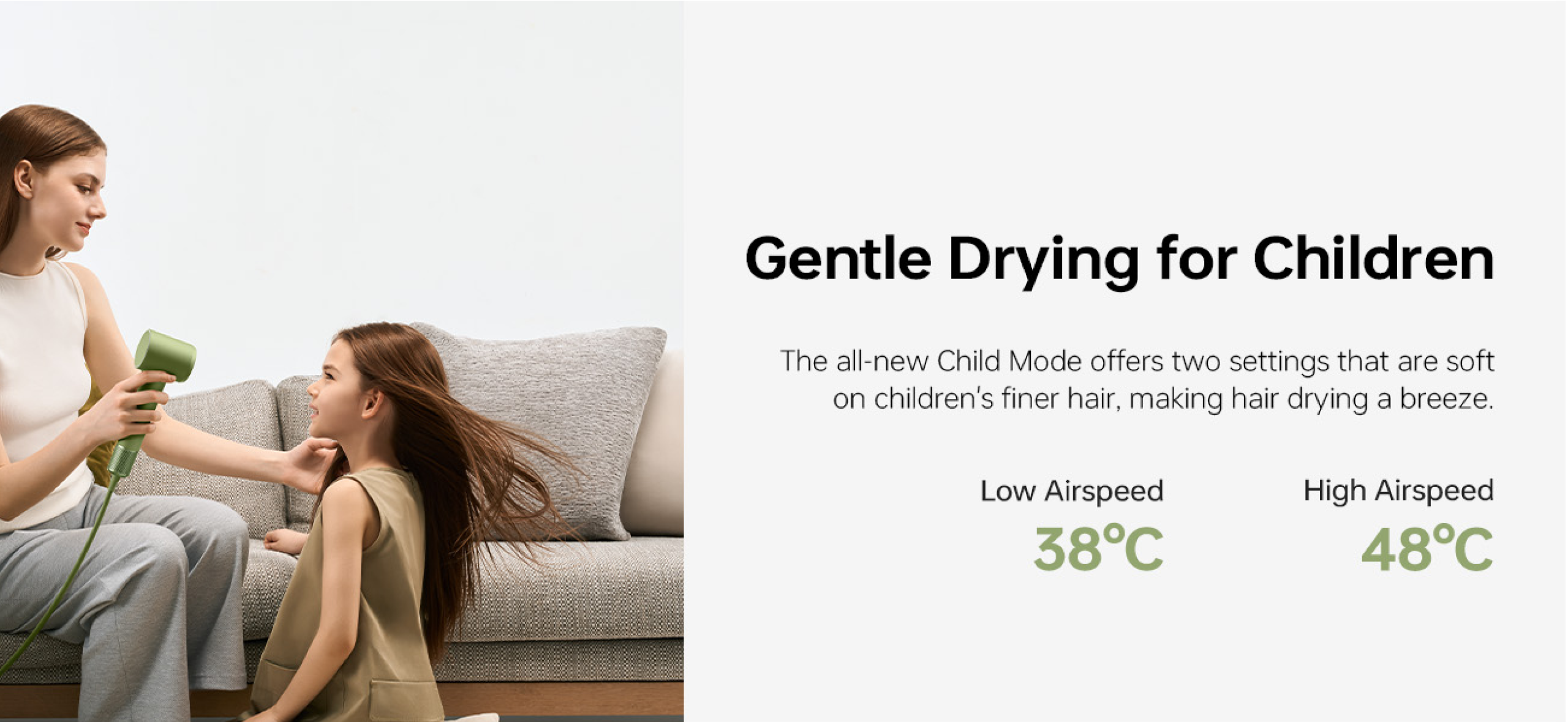 • [CHILD-FRIENDLY] The all-new CHILD MODE is gentle on the finer hair of children, providing a safer way to dry their hair. Comes with two settings, low-speed 38°C and high-speed 48°C.