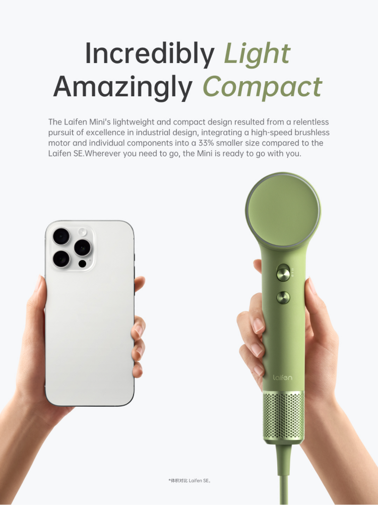1. 33% smaller volume: Data sourced from internal testing. The volume of the Laifen Mini (w/o cord or nozzle) is about 348031mm³, which is about 33% smaller than the Laifen SE.