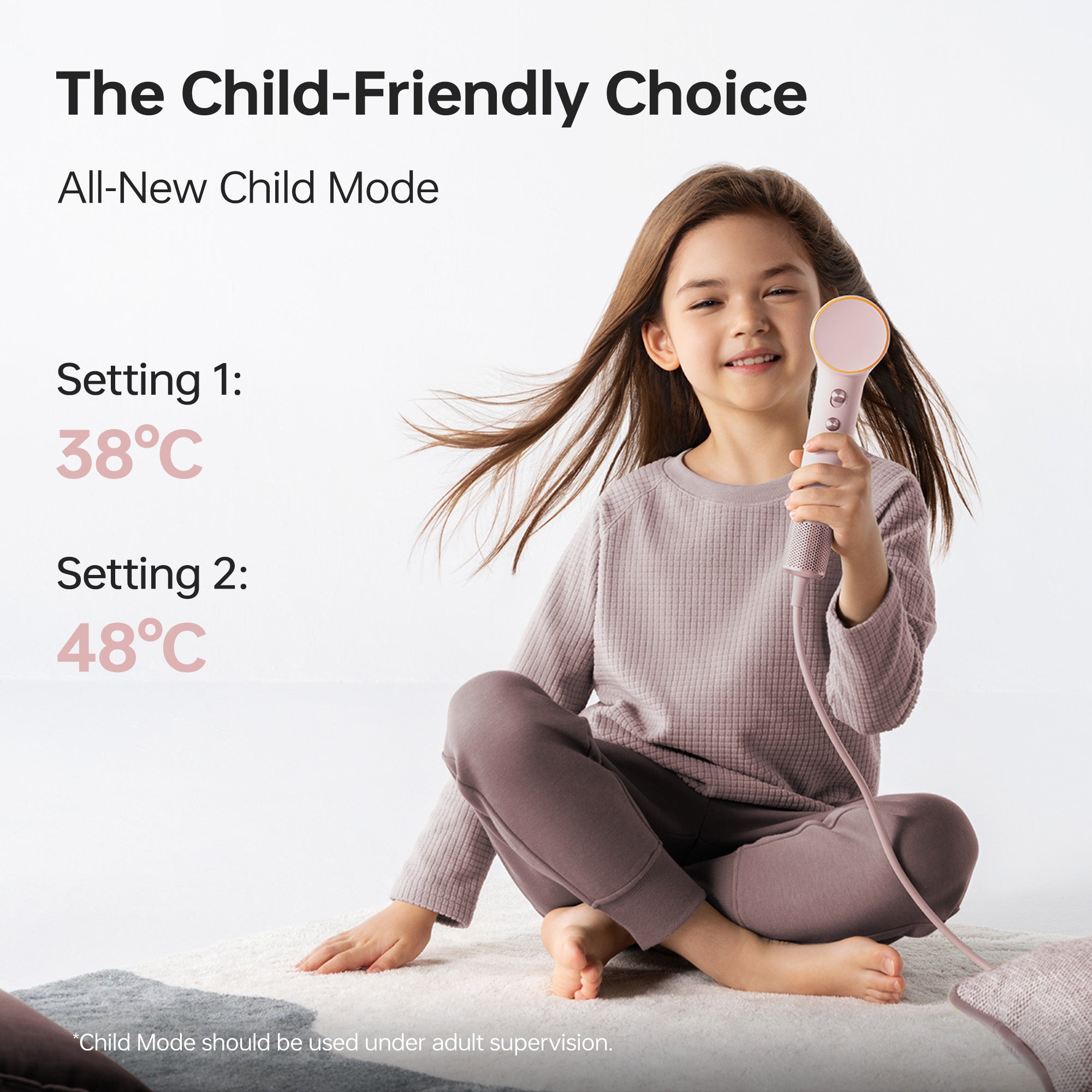 - [AMIGO DAS CRIANÇAS] O novo MODO CRIANÇA é suave para os cabelos mais finos das crianças, proporcionando uma forma mais segura de secar o cabelo. Inclui duas definições, 38°C a baixa velocidade e 48°C a alta velocidade.
