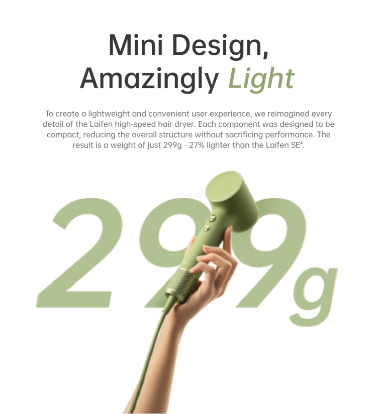 - [O primeiro secador de cabelo da Laifen a utilizar tinta tátil UV, dando ao Mini um toque de grão fino e uma aderência melhorada e CONFORTÁVEL. Disponível em 4 cores mate para combinar com o seu estilo.